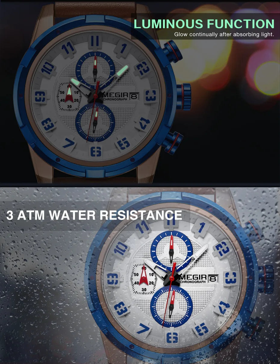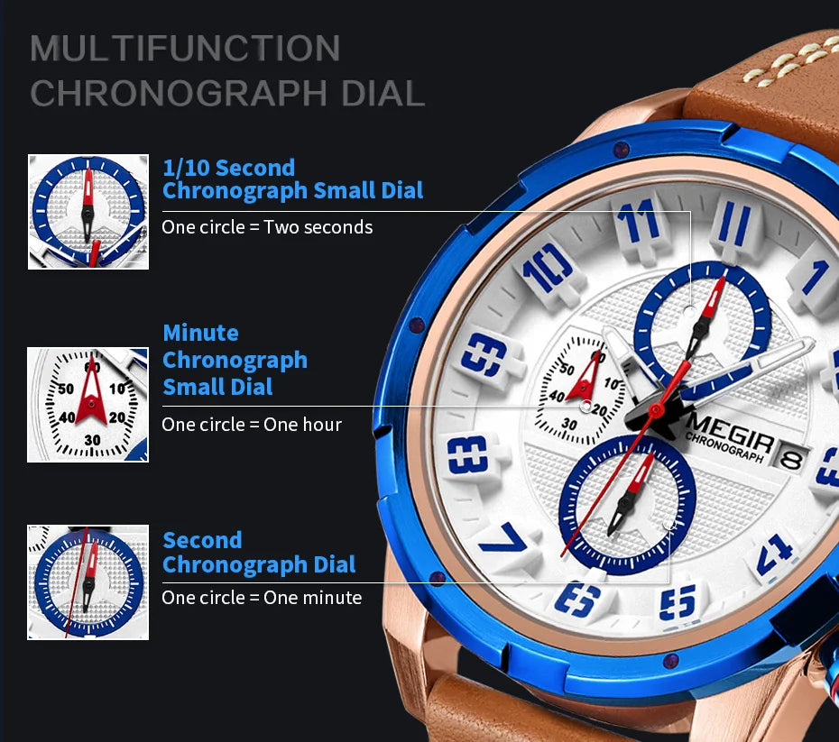 ⌚ Precise Quartz Movement: Reliable timekeeping with a MEGIR Chronograph.
