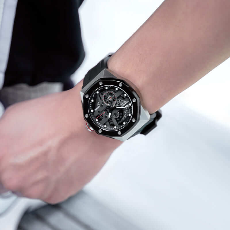 Fluororubber Strap Fluororubber, known for its extraordinary durability, stands up to any condition. Soft and conforming, it wraps around the wrist comfortably, perfect for long wear. This advanced fluororubber strap combines comfort and style, suiting the taste of discerning enthusiasts. |
