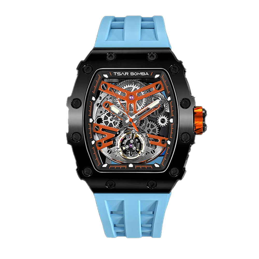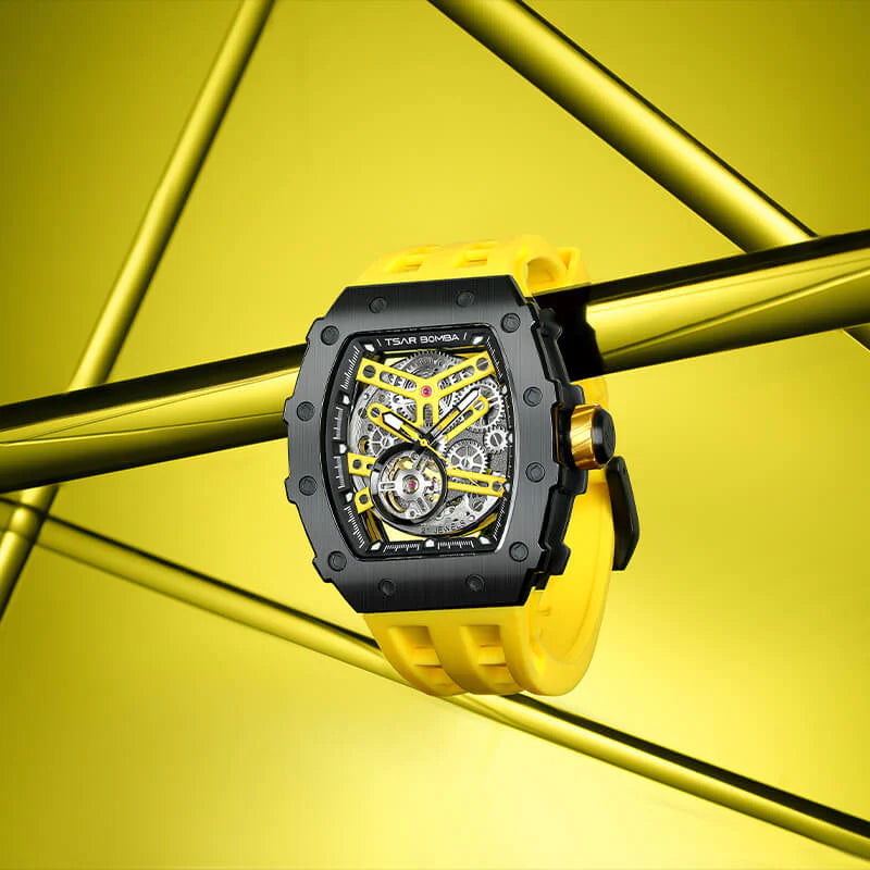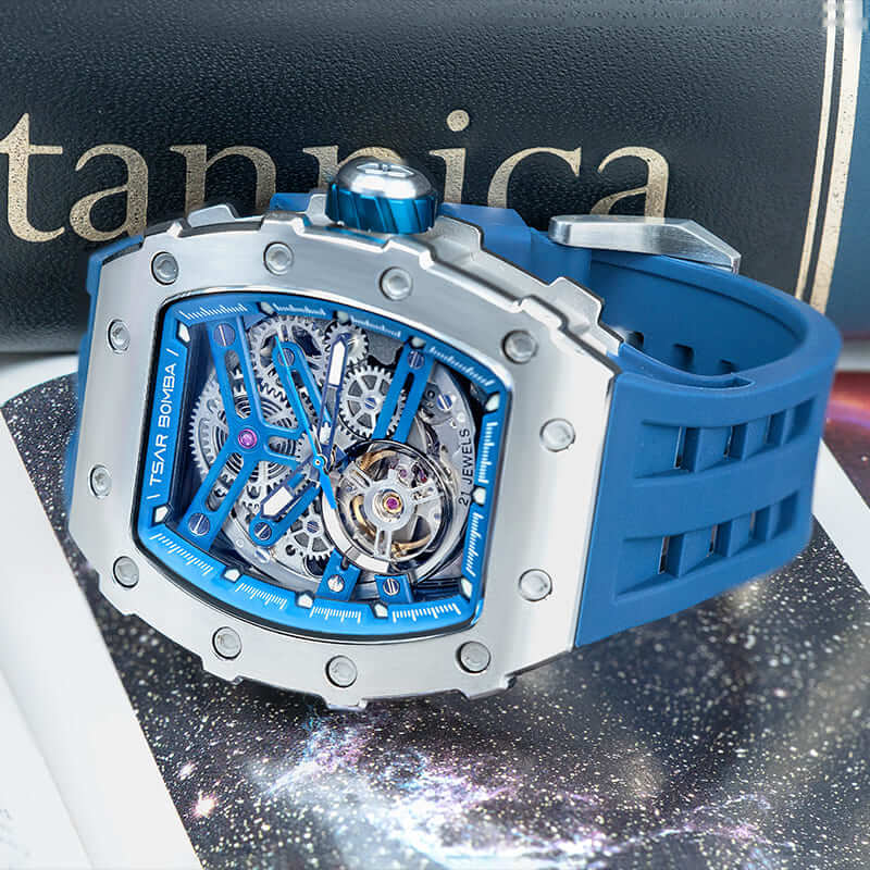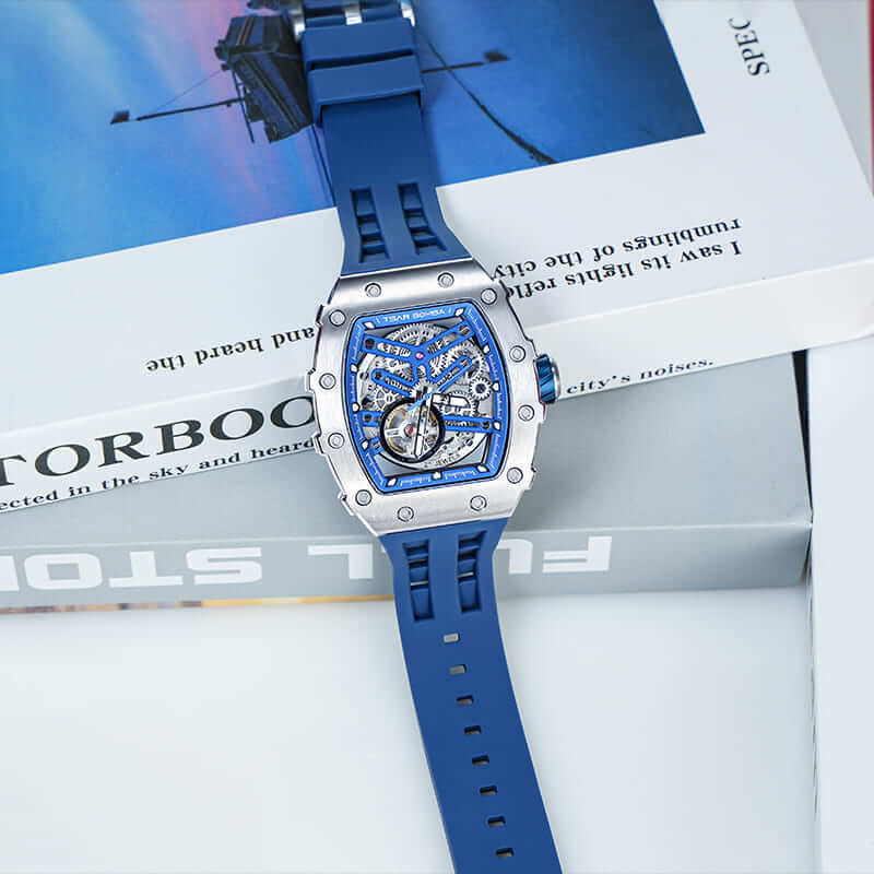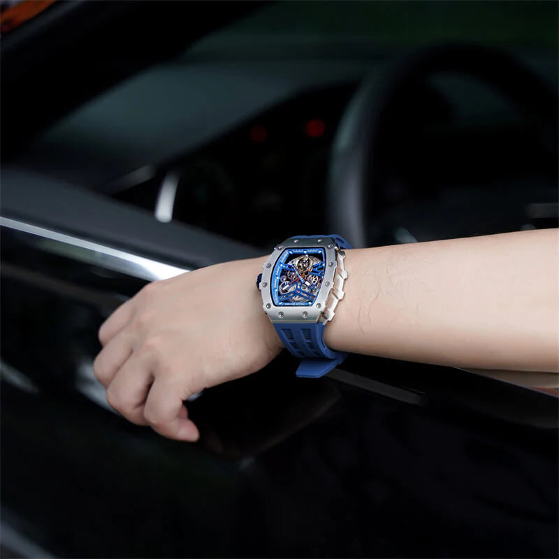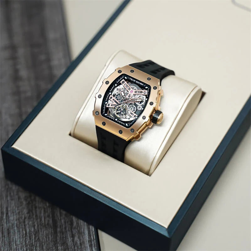 Skeleton Dial The watch's cut-out design artistically reveals its mechanical heart, where every gear and spring is finely crafted. These components gracefully synchronize, ensuring accurate timekeeping. Despite its complex mechanics, the dial charms with its simple elegance.