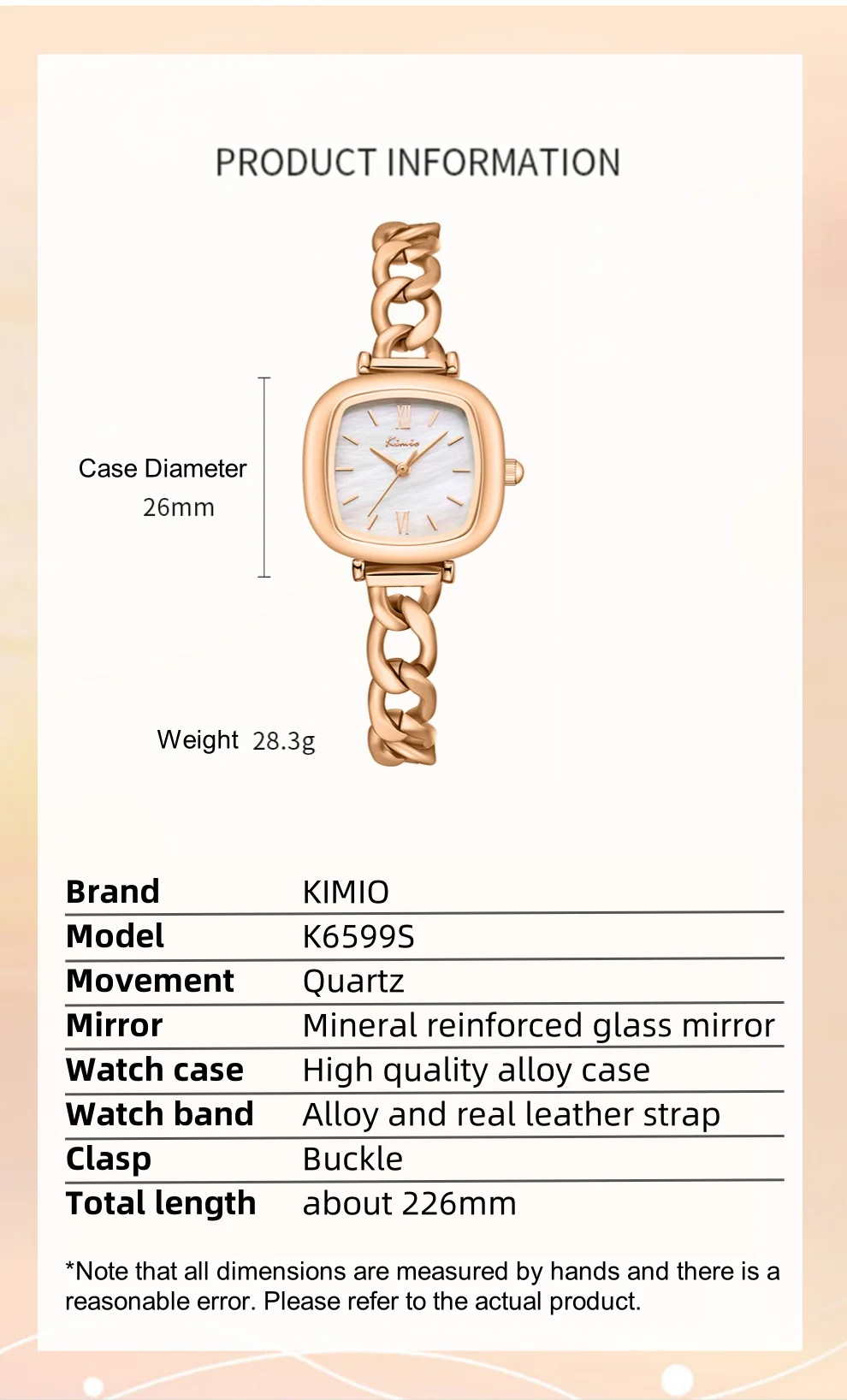 Dimensions: Dial diameter – 26mm; Band width – 10mm; Case thickness – 8.2mm; Band length – 22.6cm.